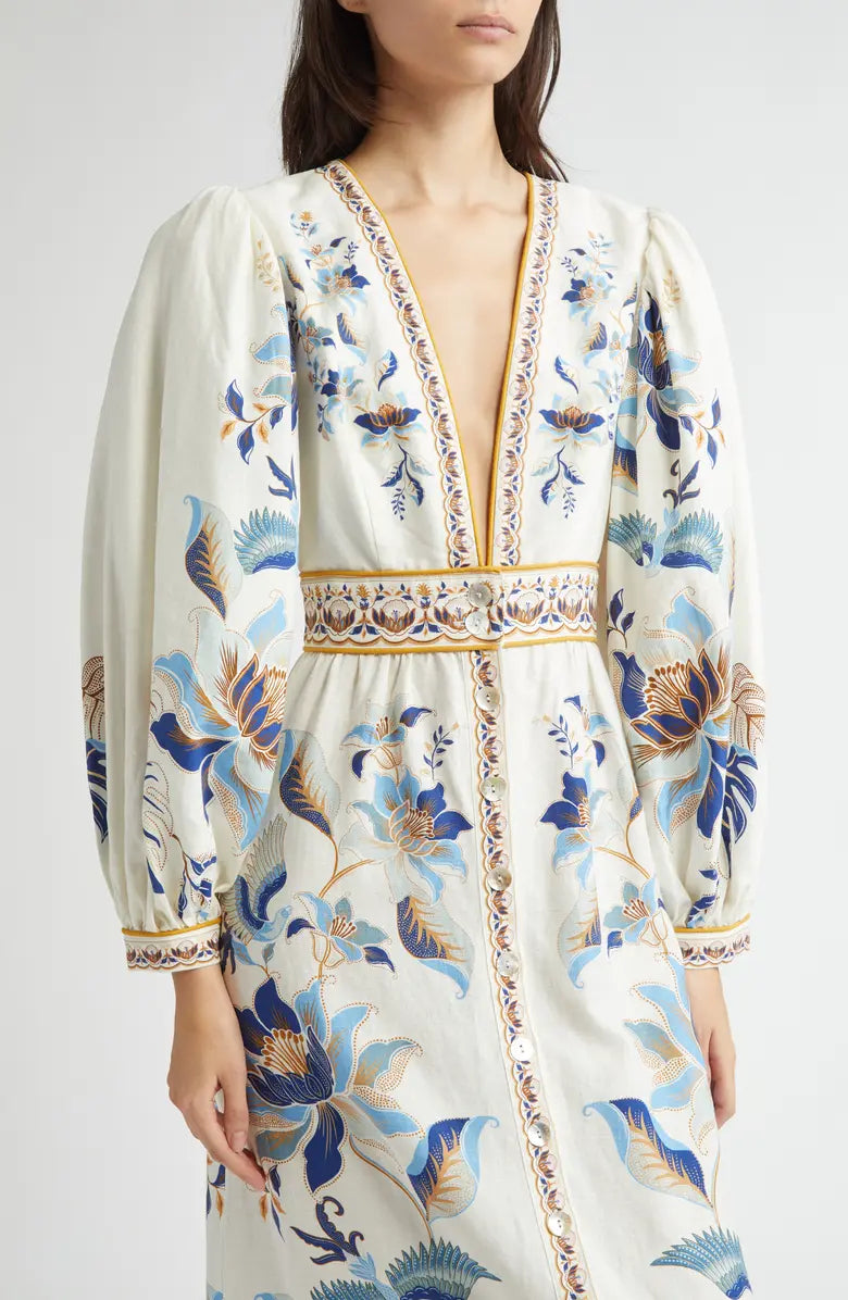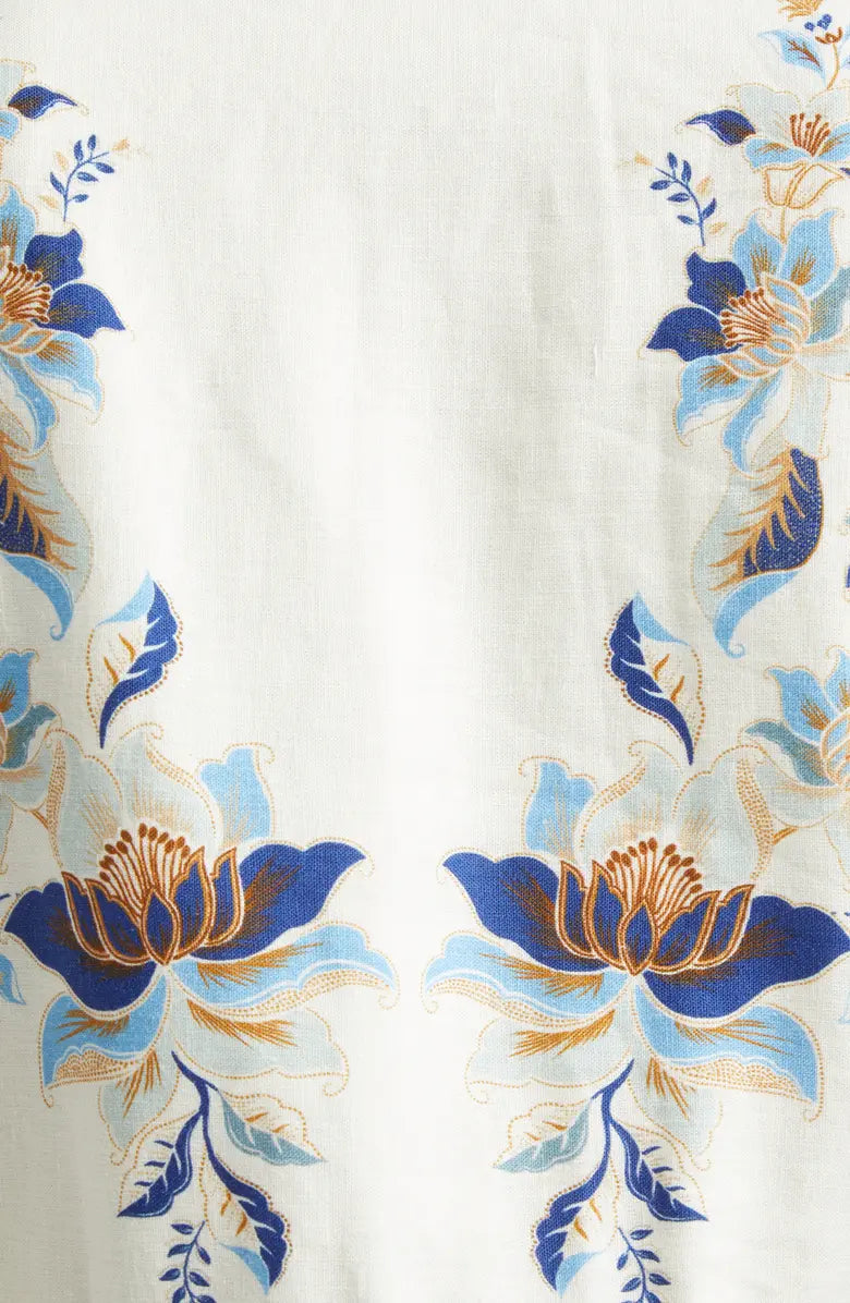 Blue Lotus Placed Print Long Sleeve Linen Blend Dress