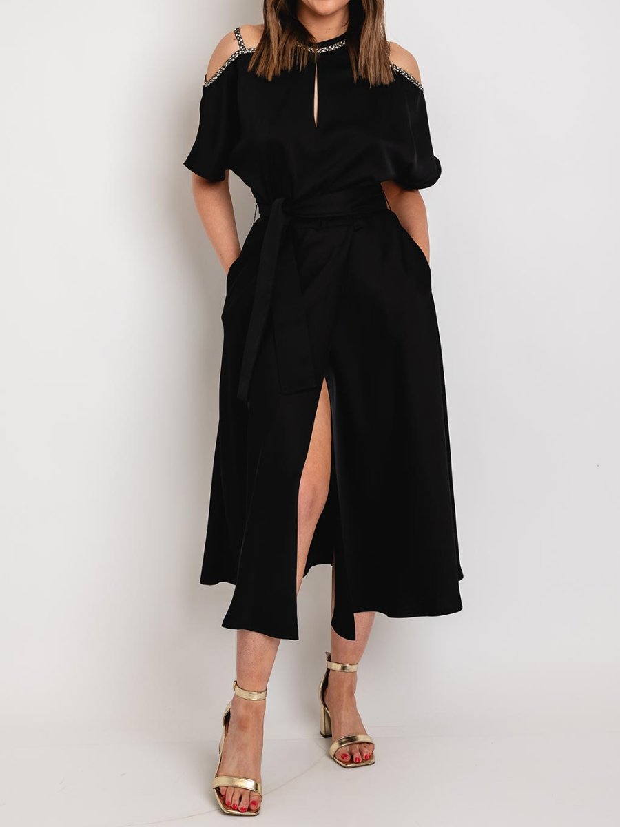 The satin touch fabric creates a luxurious feel while the cold shoulder and cutout detail add a trendy touch. The a-line silhouette and tie waist provide a flattering, cinched look.