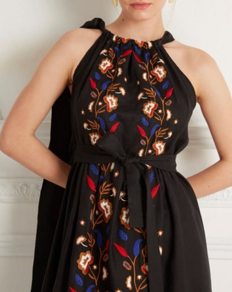 The dress featuring straps that tie at the back of the neck, a matching detachable belt, tiered details on its skirt and embellished with elegant embroideries in a floral motif.